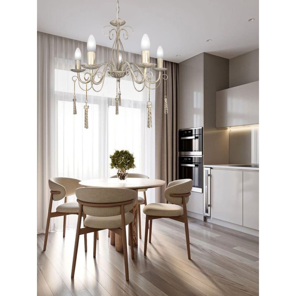 Люстра с подвесками металлическими S1297-5 от Петрасвет Представляем вашему вниманию люстру с подвесками S1297-5 от российского производителя Петрасвет. Эта модель не только освещает пространство, но и добавляет изысканный штрих в интерьер вашего дома. Ее элегантный дизайн и качественные материалы делают ее идеальным выбором для различных стилей оформления. Основные характеристики Общие данные Количество ламп: 5Ширина основания у потолка: 12 смШирина светильника: 52 смВысота светильника: 68 см Дополнительные параметры Цепь люстры: можно укоротить до 1 звена на 17 см, что обеспечивает гибкость в установке.Длина металлических подвесок: 16 см, что придаёт люстре особую лёгкость и воздушность.Площадь освещения: от 15 до 20 м?, что идеально подходит для освещения как небольших, так и средних помещений. Преимущества люстры S1297-5 Элегантный дизайн: Люстра выглядит стильно и современно, что делает её отличным дополнением к любому интерьеру, от классического до современного.Качество материалов: Производитель использует только высококачественные материалы, что гарантирует долговечность и надёжность.Удобство установки: Возможность укоротить цепь позволяет адаптировать люстру под любые высоты потолков. Заключение Люстра с подвесками S1297-5 от Петрасвет — это не просто источник света, а элемент декора, который придаст вашему интерьеру завершённый вид. Ее стильный дизайн и высокие характеристики делают её отличным выбором для любого дома. Выбирая эту люстру, вы инвестируете в качество и красоту вашего пространства.